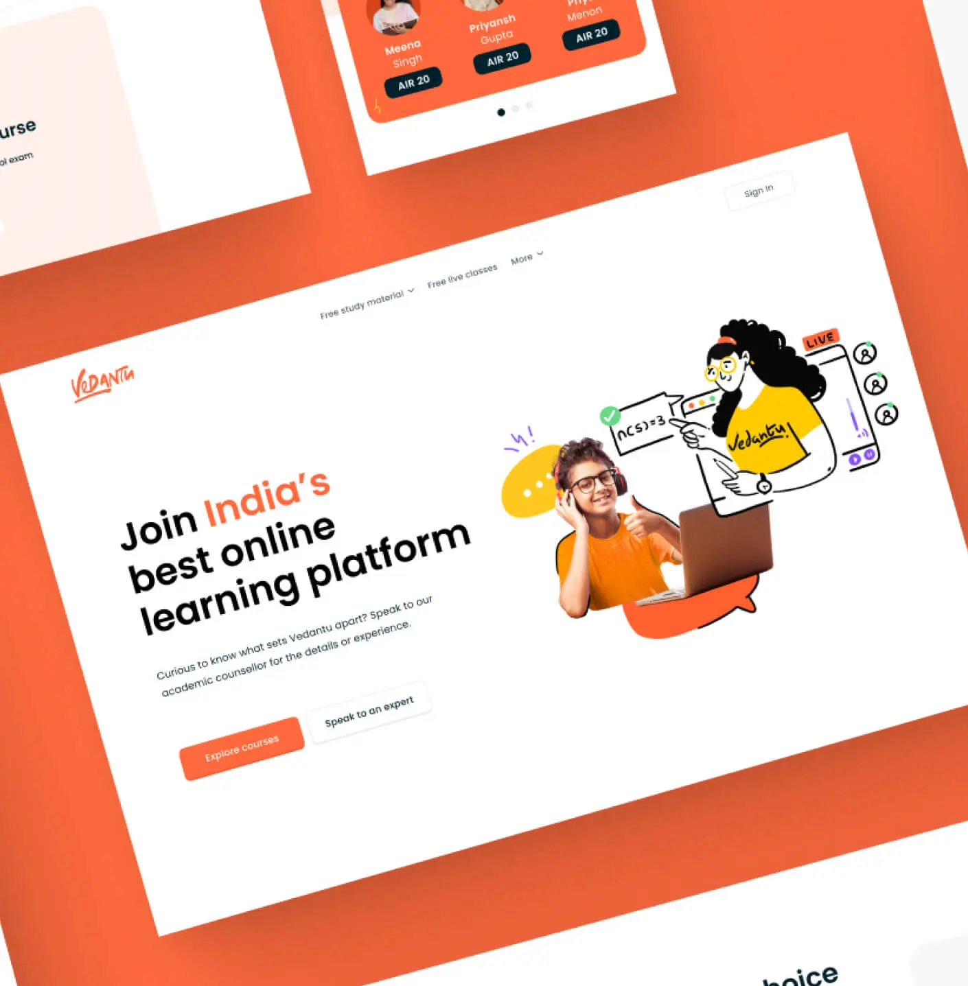 In 2022, we won the best website design award for our complete redesign of Vedantu's website. The project included expressive pictures, fun illustrations, and beautiful icons.