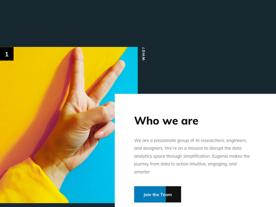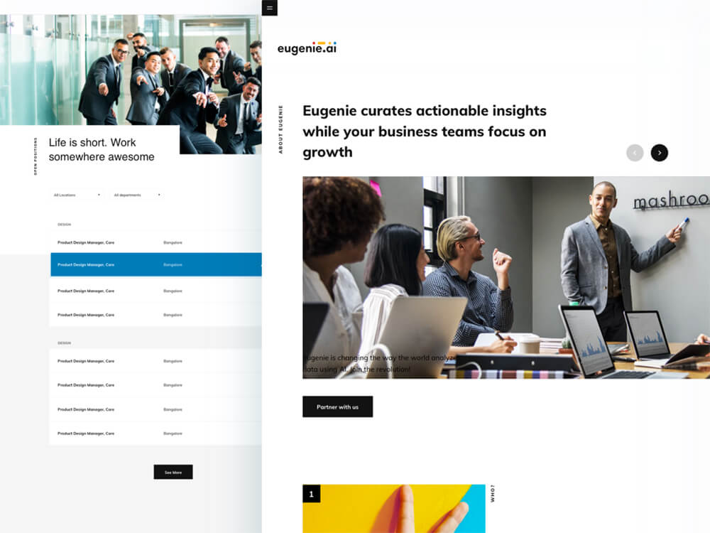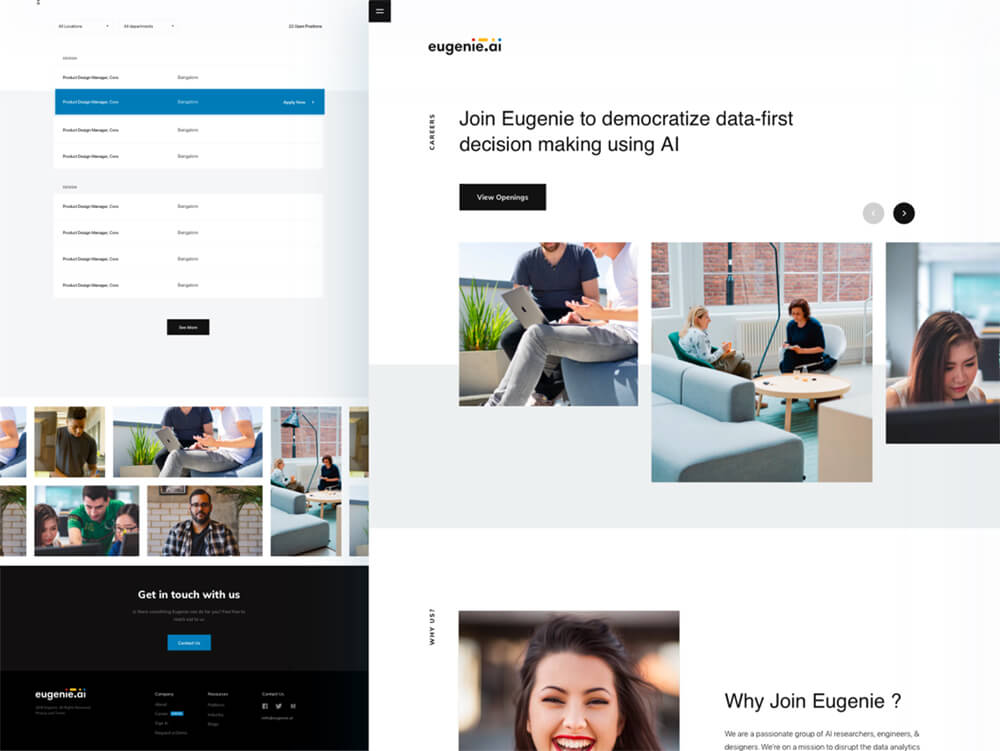 - To incorporate a modern vibe that showcased Eugenie.ai’s startup culture, we worked with Fractal to define photography guidelines. Using this guideline, we were then able to get photos that aligned with the product & design as banners across various pages. Using photos taken of the actual team at Eugenie.ai created a personalized touch, something stock photos would not be able to offer.