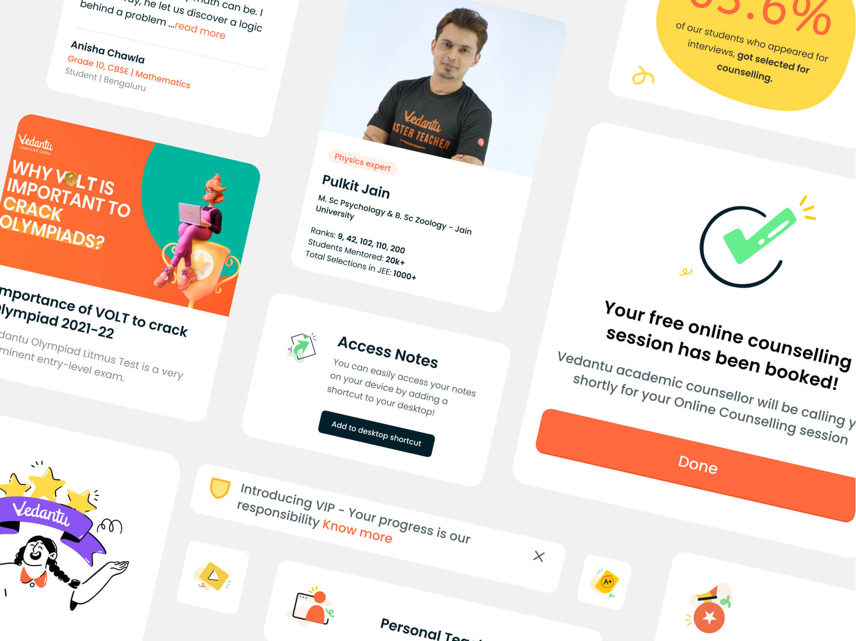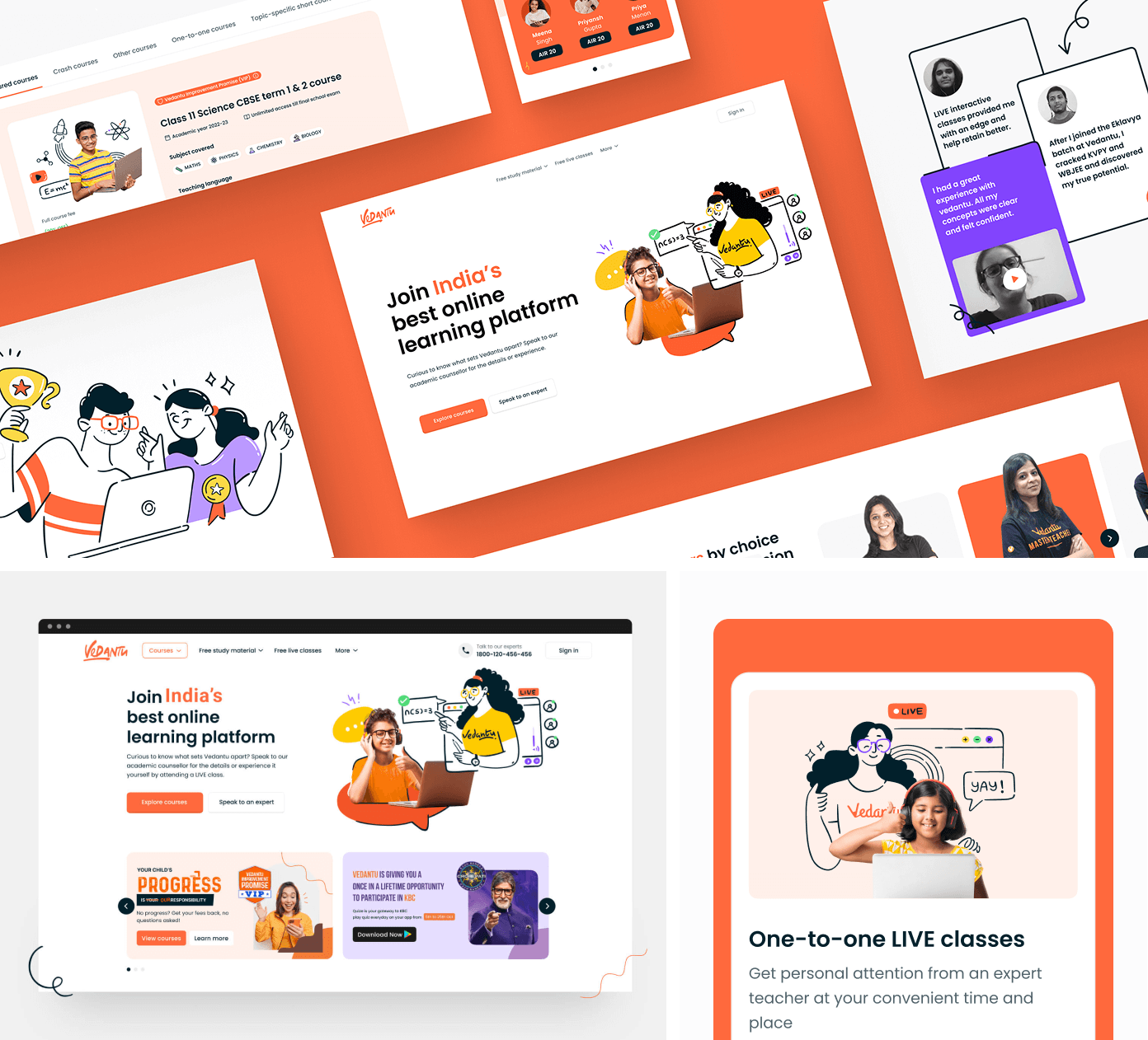 Our minimal yet playful web and mobile redesigns were enthusiastically received by the Vedantu team. The custom illustrations, icons, and visuals resonated with their vision, earning strong appreciation from the founders. Together, these efforts led to a noticeable increase in user engagement and conversion rates.