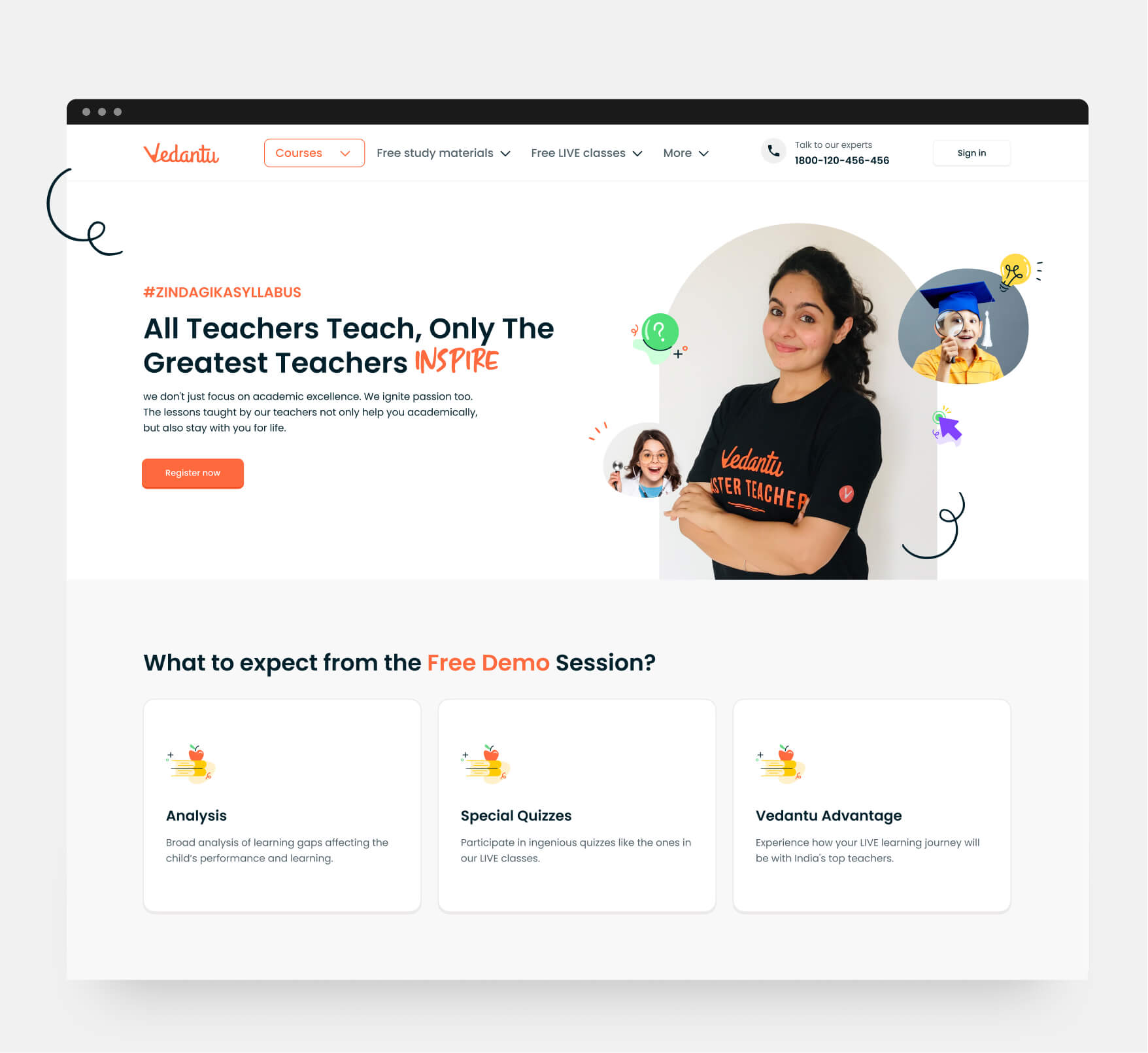 The final website seamlessly brought together strategy, design, and development to deliver a vibrant, high-performing digital experience. With playful illustrations, intuitive navigation, and a clean responsive interface, the platform made learning feel effortless and engaging — helping Vedantu connect with students in a more human and inspiring way.